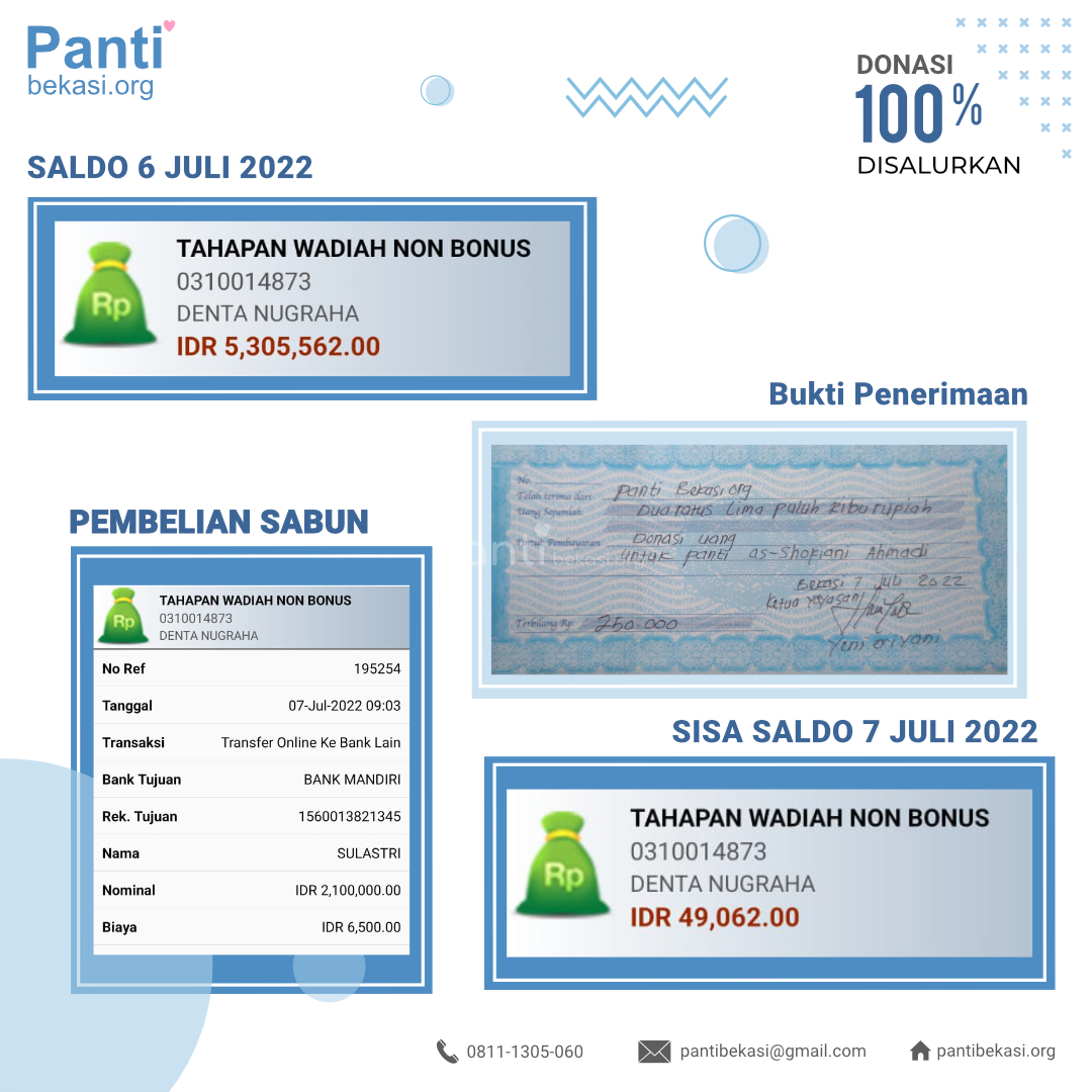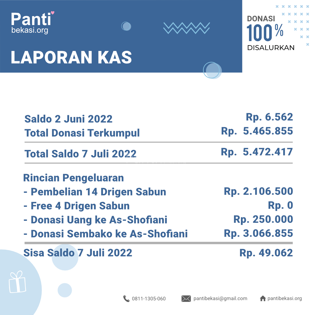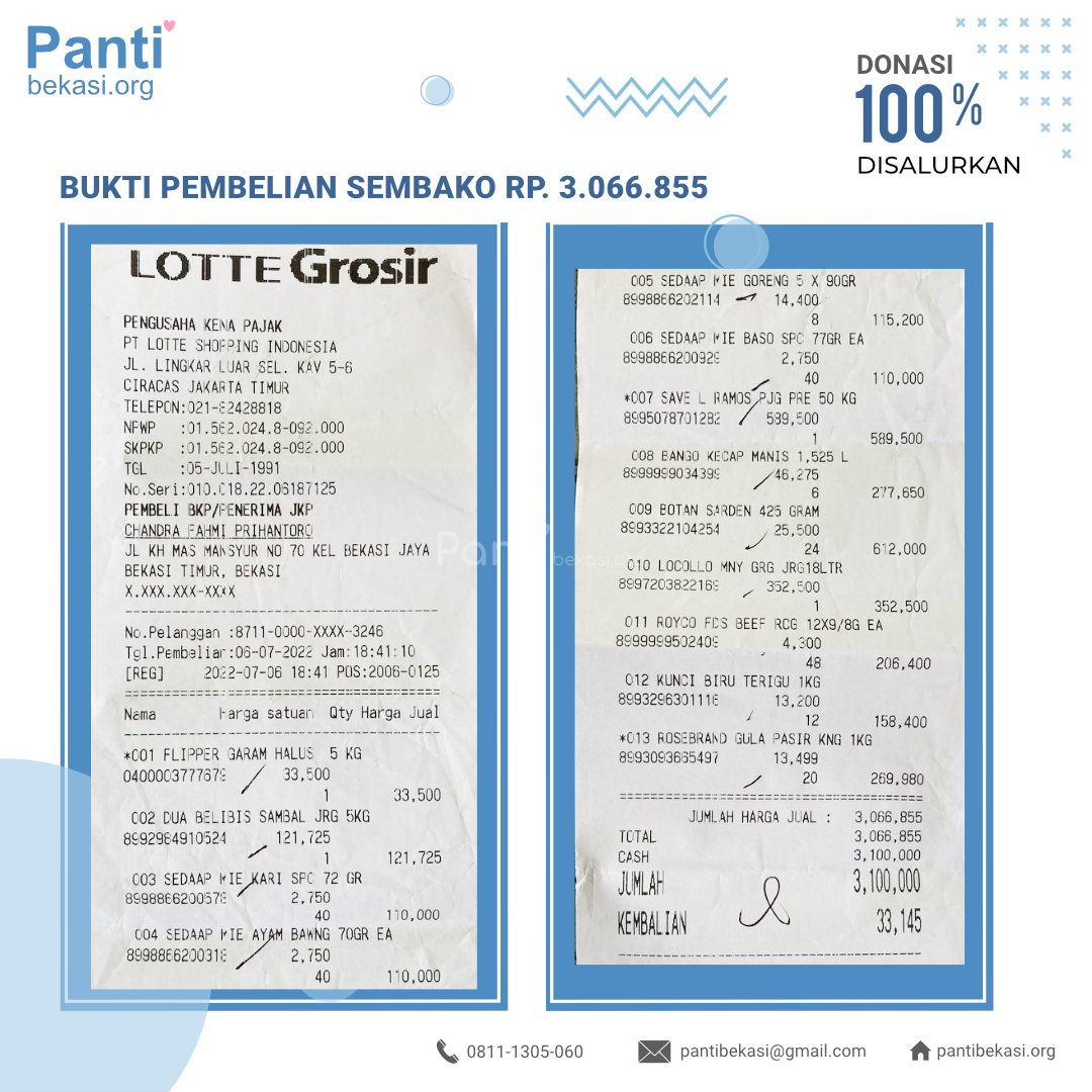 Alhamdulillah Safari Panti bulan Juli 2022 telah kami laksanakan. Pada bulan ini, sisa uang donasi yang terkumpul, kita belanjakan sembako untuk Panti Asuhan As-Shofiani Ahmadi. Alhamdulillah amanah dari kawan-kawan donatur telah kami sampaikan dan berjalan dengan lancar. Terimakasih kepada seluruh donatur yang telah menyisihkan sebagian rezekinya melalui pantibekasi.org.
