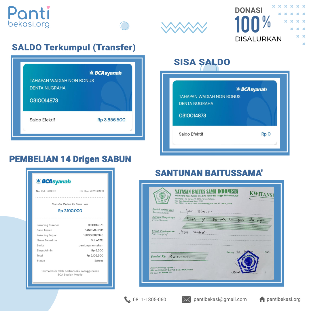 Terimakasih kepada seluruh donatur yang telah menyisihkan sebagian rezekinya melalui pantibekasi.org.