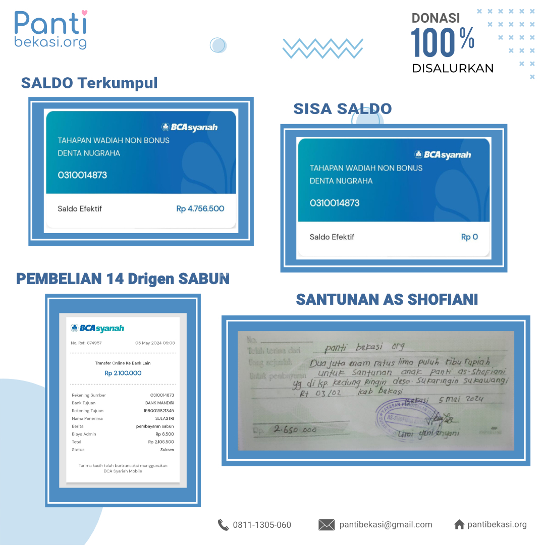 Terimakasih kepada seluruh donatur yang telah menyisihkan sebagian rezekinya melalui pantibekasi.org.
